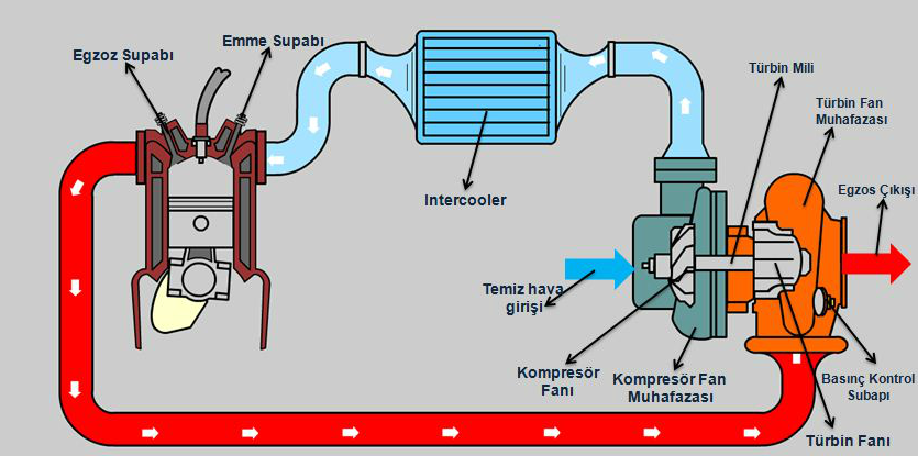 Motorun yaktığı yakıt sonucu oluşan sıcak egzoz gazları, türbini döndürür.